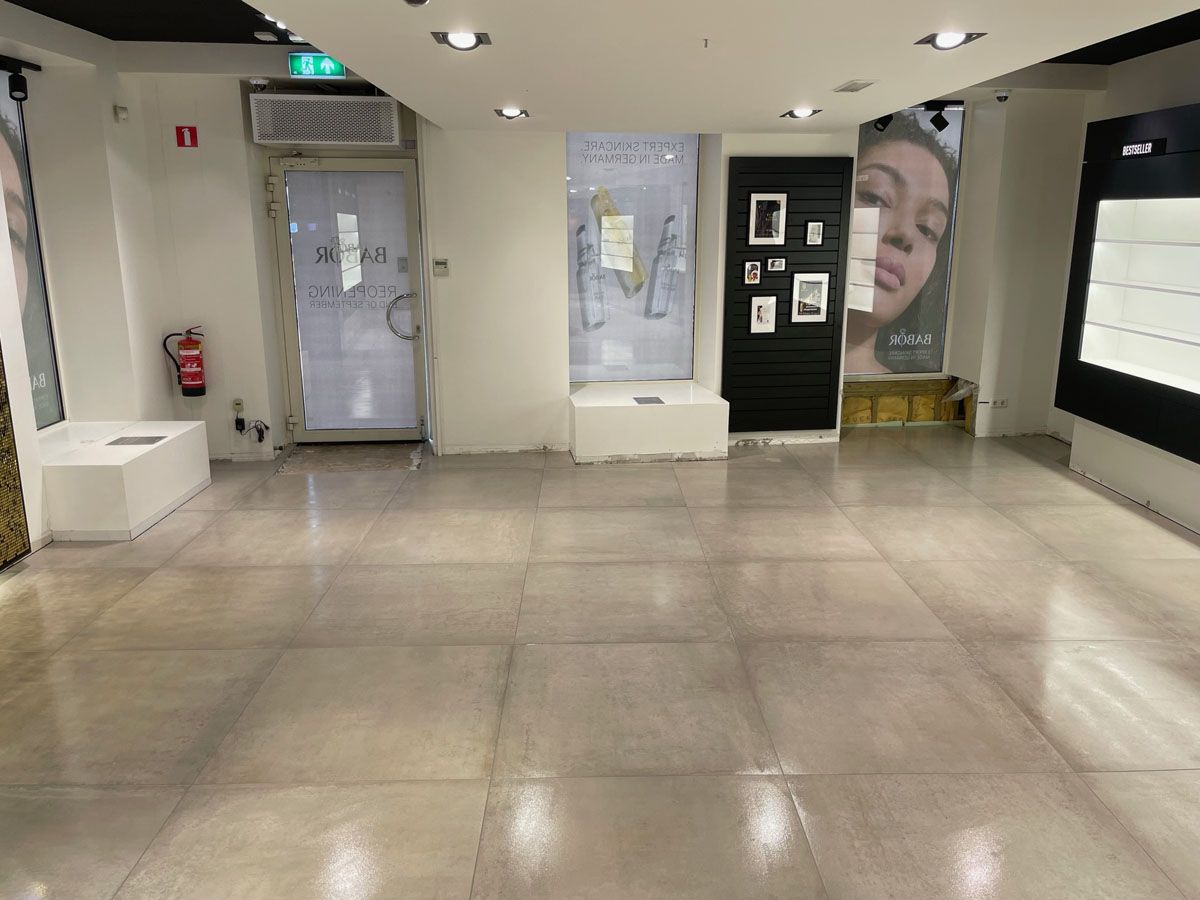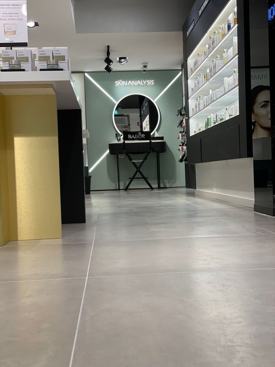 Wir entschieden uns für großformatige Feinsteinzeugfliesen in heller Betonoptik. Sie verleihen dem Raum eine ruhige Struktur und sind zugleich extrem strapazierfähig – ideal für die tägliche Beanspruchung durch hohe Kundenfrequenz. Besonders wichtig war die exakte Anpassung an Schaufenster- und Möbelfronten, um ein homogenes Gesamtbild zu erzielen.