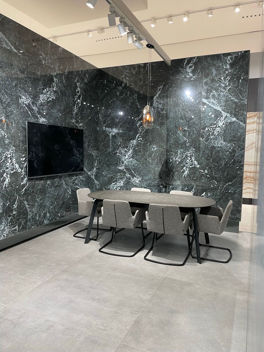 Im Eingangsbereich kamen großformatige Feinsteinzeugfliesen in Betonoptik zum Einsatz, die durch ihr ruhiges Fugenbild eine klare Raumwirkung erzeugen. Das Treppenhaus wurde mit trittfesten, fugenarmen Platten ausgestattet, die sowohl optisch als auch funktional überzeugen.