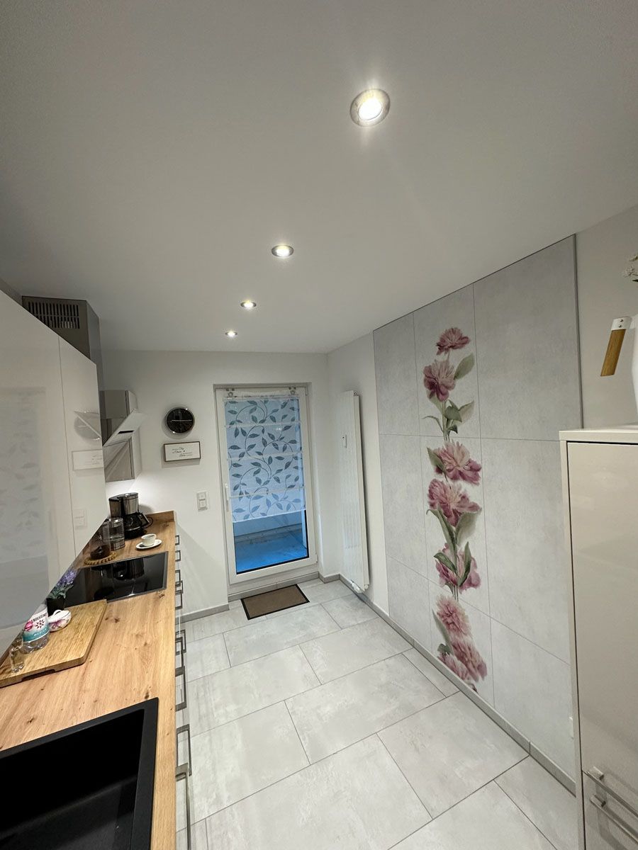 Wir setzten großformatige Feinsteinzeugfliesen in Betonoptik ein, die durch schmale Fugen ein ruhiges Gesamtbild erzeugen. Besondere Sorgfalt galt der fugenlosen Integration an Küchenmöbel und Einbaugeräte, wodurch ein eleganter Übergang zwischen Arbeitsbereich und Boden entstand.